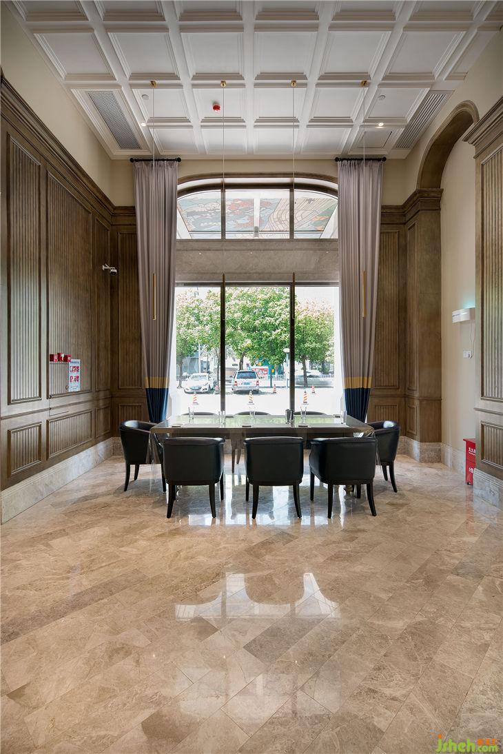 主要材料:灰橡木飾面、古堡灰石材、魚肚白石材、香檳金色不銹鋼、彩色玻璃