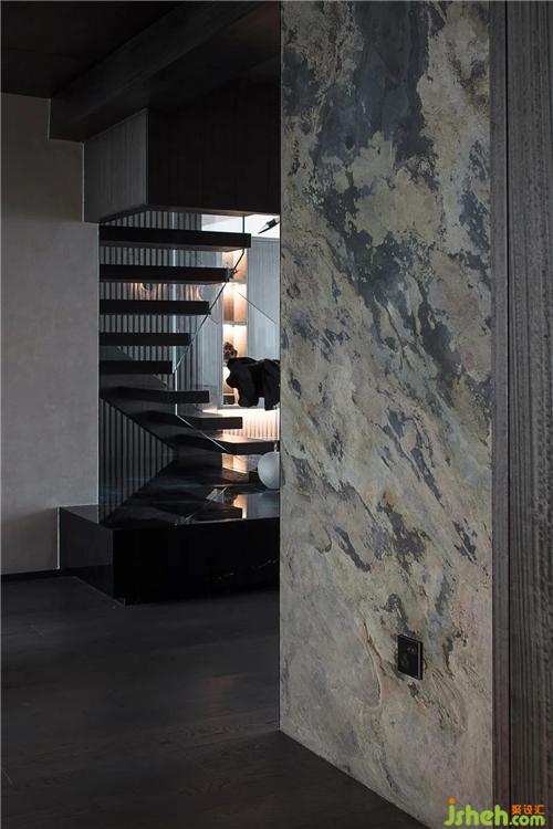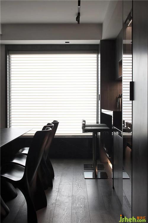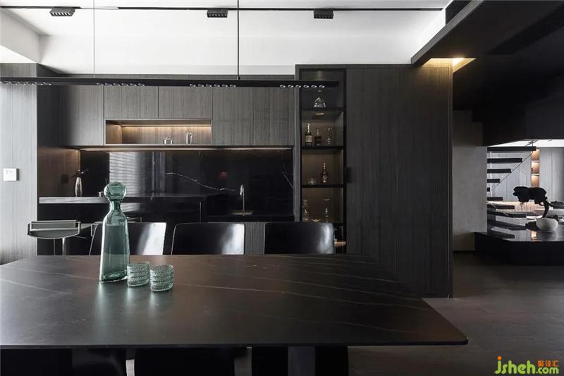 進門處的餐廳空間還是非常寬裕的,整體灰黑色調(diào),采用了局部采光,空間層次豐富。黑色大理石打造的吧臺和木飾面,木與石碰撞極具質(zhì)感,盡顯都市極簡時尚。