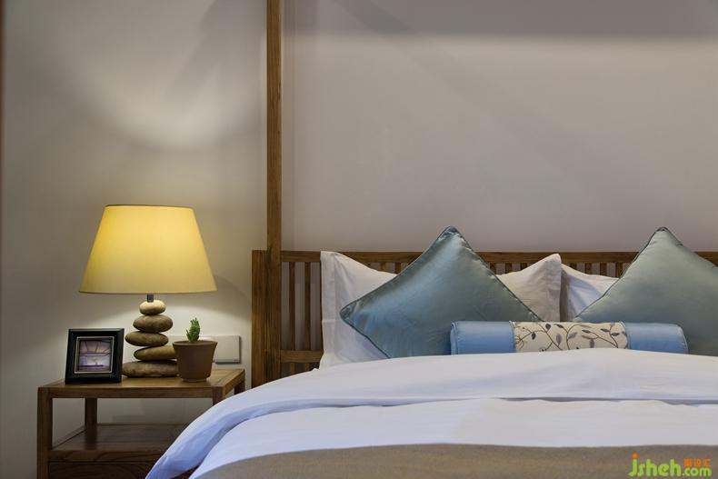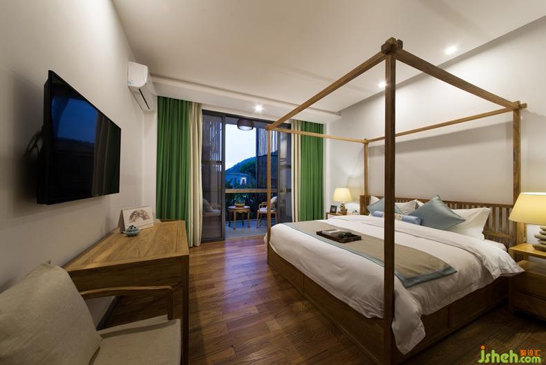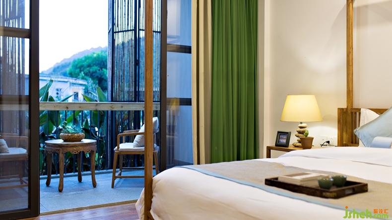 為了讓人更多的接觸自然,大量的竹、木、石是這里的主題,從大堂、餐廳、茶室到客房統(tǒng)一的風(fēng)格讓人時(shí)刻感受到鄉(xiāng)間的寧?kù)o。初入大堂,映入眼中的是一顆裝置藝術(shù)的樹(shù),樹(shù)葉由投影投射出來(lái),演繹四季的變化。天花的草編吊頂,與竹木風(fēng)格相適應(yīng)的同時(shí)也起到陰涼降溫的作用。古樸的茶室與整片荷塘僅有一面玻璃之隔,通透的落地窗讓人一眼望遍窗外的風(fēng)景,坐下來(lái)品一杯茶,溫一壺酒,賞一池蓮。餐廳古典造型的竹編燈飾、茶幾,竹柵欄與鏤空的磚石作為屏風(fēng)阻斷??头渴褂迷炯揖?,軟裝按中國(guó)節(jié)氣搭配色彩,讓人時(shí)刻擁有愉悅的心情。從草席吊頂、實(shí)木桌椅,到竹編茶幾、竹柵欄,隨時(shí)隨地都保持與自然的連接,無(wú)一不讓人感覺(jué)到溫暖安心。