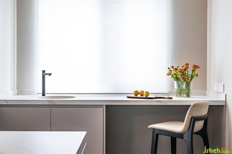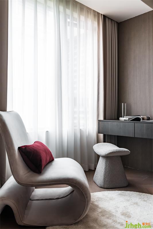 餐廳與客廳中間設置了隔斷,質(zhì)感十足的長虹玻璃既可以起到半遮擋的作用,私宅設計也能夠保持空間的通透性。綠色的植物點綴了室內(nèi),讓家中充滿生機和自然靈韻。