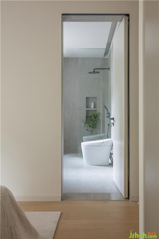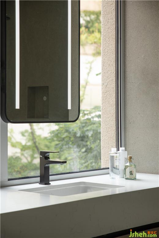 衛(wèi)生間冷灰瓷磚、大理石臺(tái)盆、柔軟地毯,