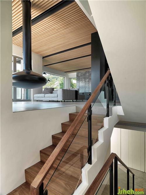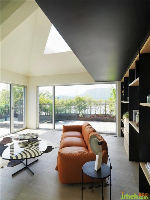 近窗處懸吊一座燒材壁爐,作為空間的溫暖象征,猶如雕塑品般的地佇立于空間之中。