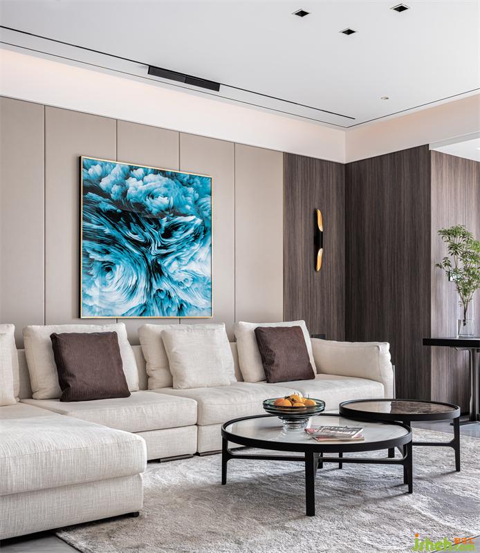 客廳空間整體基調(diào)都以素色雅致為主,開(kāi)闊的空間布局帶來(lái)了極佳的視野和光線,把景觀陽(yáng)臺(tái)納入客廳使用,增加了客廳的通透性,極簡(jiǎn)空間里點(diǎn)綴著一小片靛藍(lán),隨著陽(yáng)光消隱,室內(nèi)會(huì)愈發(fā)清簡(jiǎn)而開(kāi)闊.