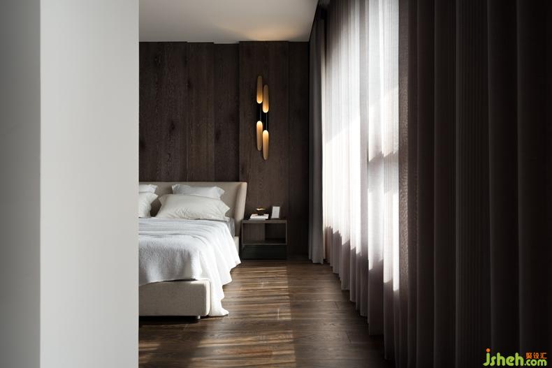 主臥室善用床尾視聽牆當分區(qū)介質,增設專屬更衣間機能,視聽牆正面採皮革軟繃,縱向的分割線條,恰與床頭牆面立體堆疊的木質板塊相呼應。
