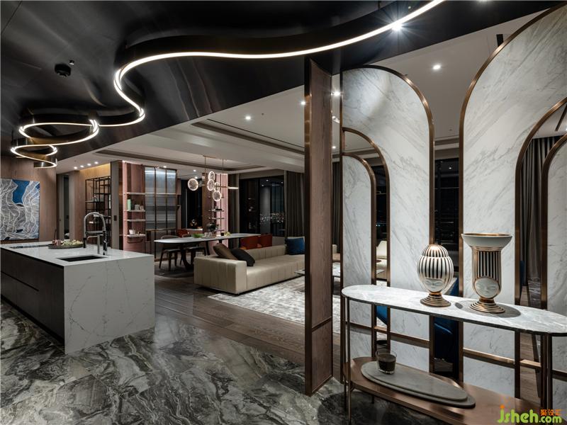 在玄關(guān)、中島廚房與客廳之間,除了靈活運用差異地材鋪設(shè)、天地壁的黑白色相對比、訂制家具燈藝擺設(shè)等手法,象征性劃分場域?qū)傩酝?,于細?jié)處的經(jīng)營尤其深刻,像是蜿蜒騰飛于玄關(guān)至中島上方的大型金屬流體燈藝,設(shè)計者取屋主事業(yè)有成、衣錦還鄉(xiāng)為名,交融魚形線條和水岸波紋無邊無際的優(yōu)美大器,打造公領(lǐng)域動中有靜、靜中有動、獨一無二的主視覺概念,隱含其中的情感因子,也醞釀出空間的無垠詩意。而中島后靠背景墻同樣饒富機趣,老師傅親手施作的潑墨砌花工法,對話兩側(cè)鍍鈦金屬、條紋玻璃立面,不僅富于藝術(shù)性,也平添空間相對柔軟的人文底蘊。
