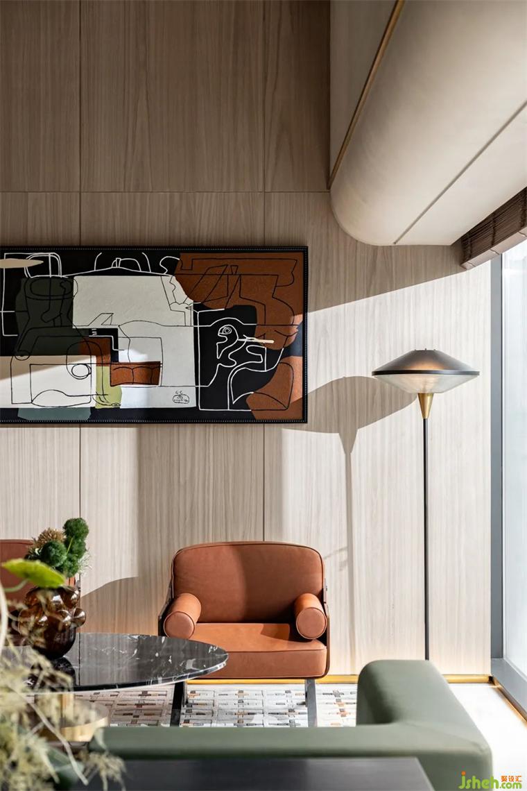 VIP室,陽(yáng)光透過(guò)大面積玻璃窗,遠(yuǎn)處的山巒歷歷在目,裝修設(shè)計(jì)凝思中事物的物象溶為一體,可謂吸納了山巒的靈光。