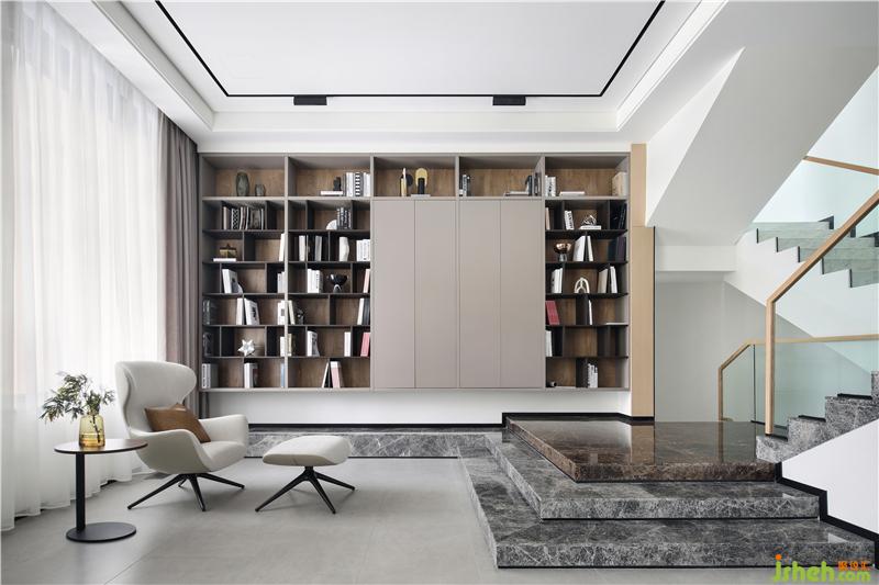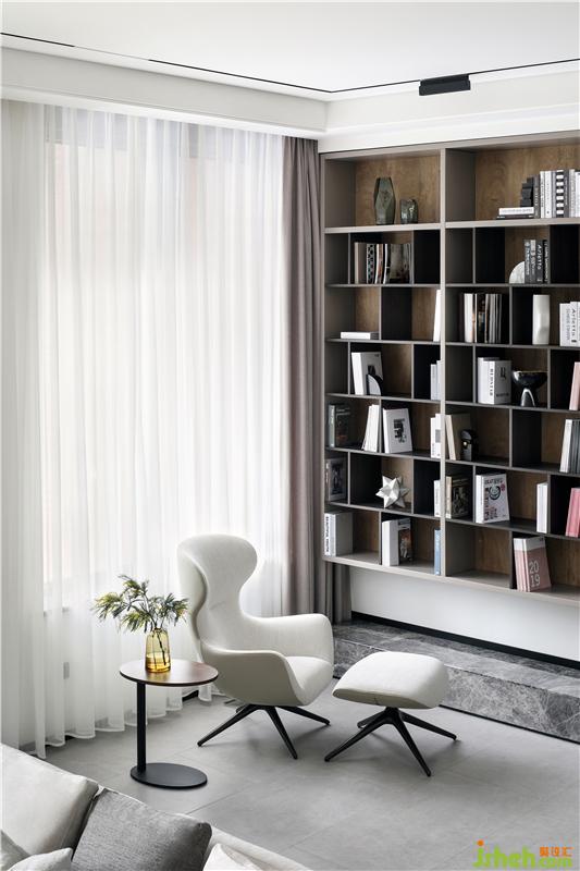 休閑廳為客廳的補充空間,位于樓梯平臺旁,沉穩(wěn)質感的書柜鋪滿整面墻,如源頭活水般浸潤著整個空間,正是“書卷多情似故人,晨昏憂樂每相親”。