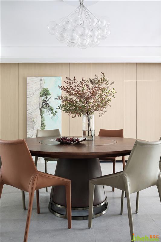 原木材質的家具,油畫中遒勁的峭壁蒼松,餐桌上的疏影橫斜的瓶盞,自然質樸,在濃淡相宜的雅致中,愈增清新與活力。