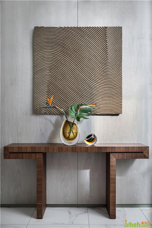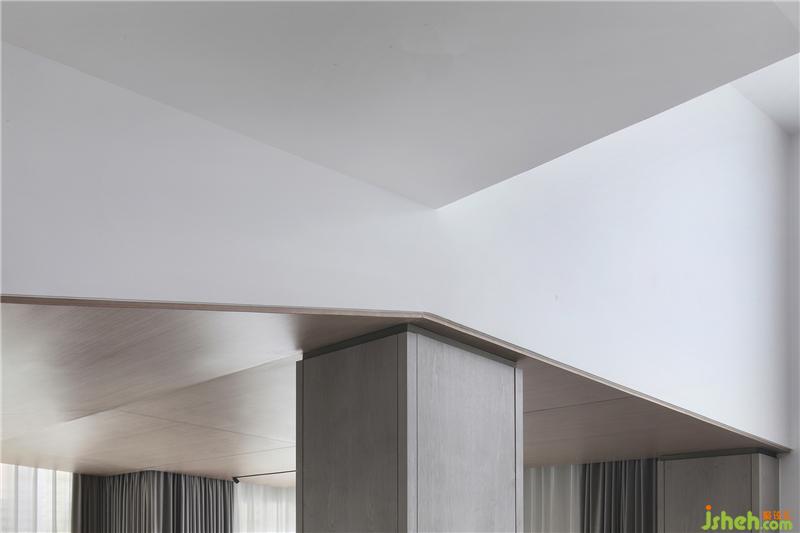 在本項目的空間中,直角折線將冷暖融會平衡,譜寫出和諧的旋律,使空間形成內(nèi)在統(tǒng)一的渾融秩序。鈍角折線則試圖沖破發(fā)出強音,卻終因內(nèi)質(zhì)的柔和而趨于悠揚,打破空間和諧秩序的同時,讓空間變得富于潤度。當今時代“擬物”審美的催生、極簡風的盛行都離不開人們重新審視自然的眼光。返璞歸真、回到物本身……都不僅僅再是一個口號,而是空間迫切需要灌注的養(yǎng)分??臻g本身就有著自己的呼吸開闔,一呼一吸,無拘無束,自然而然。 理性嚴謹?shù)目蛻粝矚g天然的木質(zhì)材質(zhì),沒有現(xiàn)代的奢華感,充滿溫暖。設(shè)計師因此在空間中運用了大量的原木元素:木質(zhì)屏風、沙發(fā)底座、臺燈底座、木質(zhì)樓梯、木質(zhì)版畫、木質(zhì)方幾……無不流露出濃郁的自然雅韻。