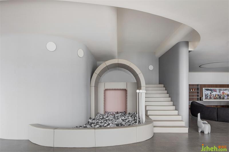 新辦公區(qū)設(shè)計(jì)為滿足客戶的家庭需求,專門為陪父母看方案的小朋友設(shè)置了兒童玩耍區(qū)域,趣味安全。海洋球延續(xù)空間的主體色調(diào),采用了灰白色,與整體空間在色彩上保持和諧。