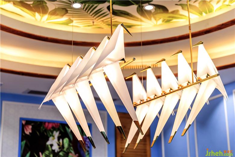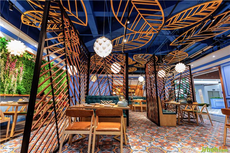為凸顯新派粵菜餐廳的潮流感,設(shè)計(jì)師在該設(shè)計(jì)中以熱帶風(fēng)情為主題