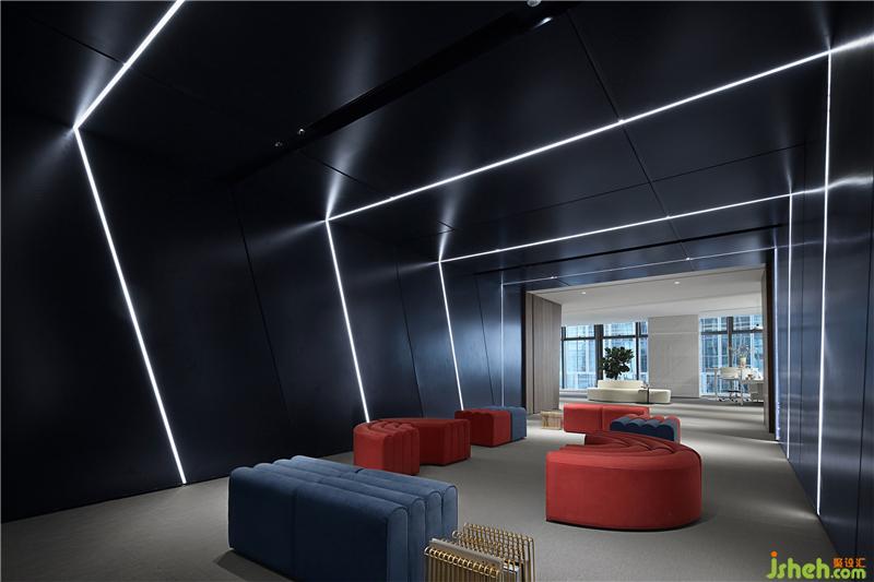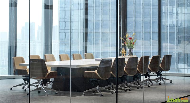 大面積玻璃代替厚重墻體,輕薄的線條邊框隱匿其中,共享會議室的物理分區(qū)體量被減至最小?!巴该骱凶印钡慕Y(jié)構(gòu)被光線打通,一個高端質(zhì)感迭代空間內(nèi),空間與工作發(fā)生緊密而富有無盡創(chuàng)造力的未來。裝修設(shè)計