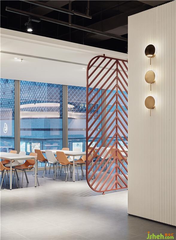 “變化”是人們心中一種認(rèn)同式的渴望。我們用“虛實(shí)體塊結(jié)構(gòu)”打破了一望到底單調(diào)通長的空間,高低錯(cuò)落的空間布局豐富了視覺層次,精心營造高峰下的就餐秩序?yàn)榇┧笤谄渲械娜藗冊(cè)鎏砹藷o窮樂趣。餐廳設(shè)計(jì)
