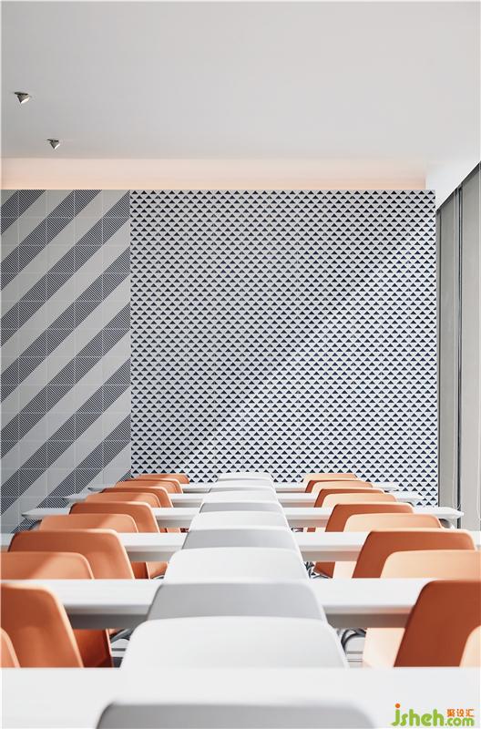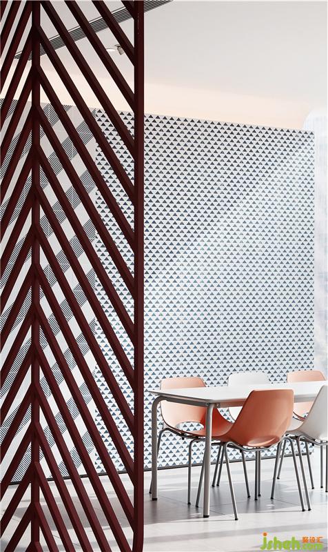 躍動(dòng)的色彩搭配不同肌理的幾何圖案取代了中規(guī)中矩的灰白色系,大膽的對(duì)比挑逗人們的視覺神經(jīng),創(chuàng)造了明亮活潑、讓人眼前一亮的視覺焦點(diǎn),成功為空間減噪。 餐廳設(shè)計(jì)