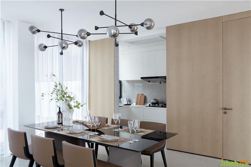 就餐區(qū)的樣板房設(shè)計(jì)以簡(jiǎn)雅為意。淺色皮質(zhì)餐椅與大理石相得益彰,精致的酒杯圓盤等器物在清新綠葉的映襯下抒寫四季三餐的溫馨。