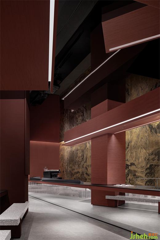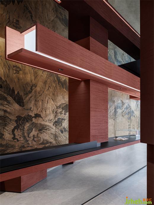 畫作靈感源于《清明上河圖》,提取其寫實又浪漫的“反差感”,茶樓設計在古畫《上林圖》《惠山茶會圖》《攆茶圖》三者基礎上進行筆墨添減,并結合現(xiàn)代人的觀念及傳統(tǒng)的銅版工藝做出描繪。