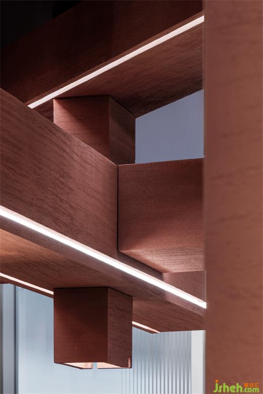 ”隼為陽、卯為陰。榫卯之變化,謂為中國建筑之變化?!辈铇窃O計梁與柱的接駁處,我們用榫卯咬接作為節(jié)點,搭建富有彈性的立面框架。