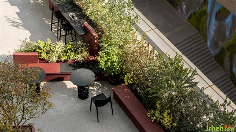 風(fēng)化紅壤土斑駁的紋理充滿歲月古老的粗糙感,從觸感、觀感都完美復(fù)刻了土壤的風(fēng)化斷層面。茶樓設(shè)計(jì)火山黑巖板與之形成意象色彩沖突,重現(xiàn)著古老的自然演化過程。