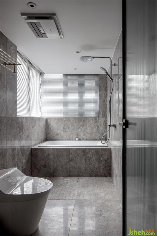 主衛(wèi)灰白色系讓整個空間簡單而利落,除了頂部的浴霸,家居設(shè)計了射燈,達到最大的照明功能。百葉窗式的簾子與花巖色的瓷磚營造出舒適的氛圍。