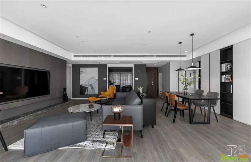 整體空間盡量簡(jiǎn)單、干凈、質(zhì)感、舒適,簡(jiǎn)單柔軟的深灰色皮沙發(fā)和姜黃色的單人位沙發(fā),讓活動(dòng)空間自由而純粹。沒(méi)有過(guò)多的造型和復(fù)雜的裝飾,嵌入式的電視鑲嵌在背景墻中,連所有的電源線都被完美的收納在其中,看不到一絲雜亂。