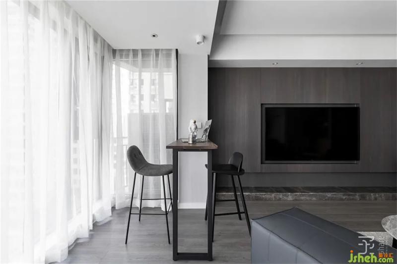 客廳打破了傳統(tǒng)格局,打通陽(yáng)臺(tái),在靠電視墻一處設(shè)計(jì)了小吧臺(tái),讓屋主在這里簡(jiǎn)單的辦公、喝茶、聊天等。陽(yáng)臺(tái)放置一個(gè)慵懶的沙發(fā),在周末陽(yáng)光灑進(jìn)來(lái)時(shí)可以看看書(shū),或練練瑜伽。