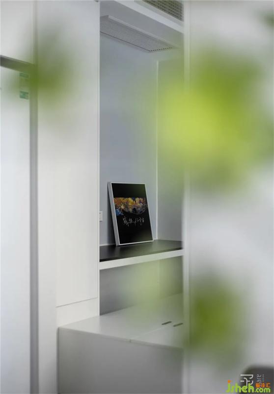 過(guò)道空間的墻面空間做成與衣帽間相鄰的雙面柜,一面為衣帽架的衣柜,一面為雜物柜兼部分展示柜功能。