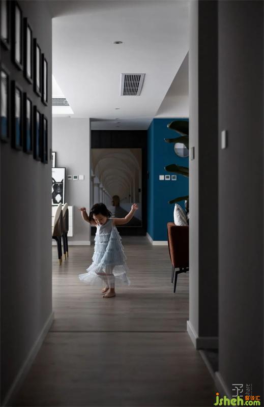 軟萌的橙色小鹿搭配深邃的歐式建筑過(guò)道,深藍(lán)的乳膠漆墻面銜接深灰色的木質(zhì)面板,無(wú)形中加深了空間的縱深感,帶給空間無(wú)限的可能。生命中許多吉光片羽,我只愿蓬勃生活在此時(shí)此刻,去決定怎么愛,怎么活。