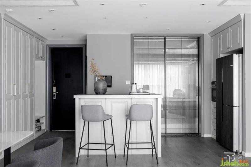 單一的灰調(diào)并不能完整的表達(dá)出設(shè)計(jì)師想要傳達(dá)的內(nèi)在情感,唯有調(diào)和與融入,才是色彩設(shè)計(jì)的初心所在。而那一抹溫暖的咖色,于灰度的空間中,呈現(xiàn)遞進(jìn)式的鋪展,悄無聲息之中,營造出 豐富的層次感,為空間注入生機(jī)與靈氣。