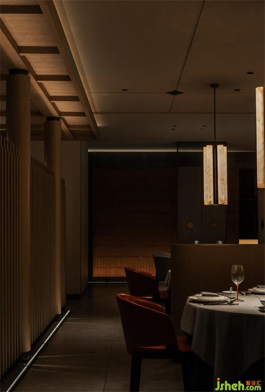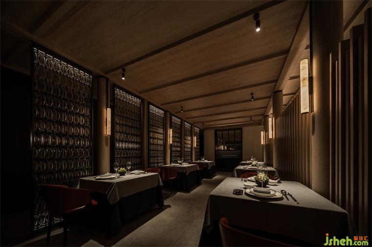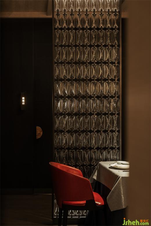 移步換景,數(shù)塊透光玻璃屏風(fēng)與沉穩(wěn)的木調(diào)形成對(duì)稱,卡座燈光之間的相互呼應(yīng),給予場(chǎng)域尺度感和溫暖的氛圍。