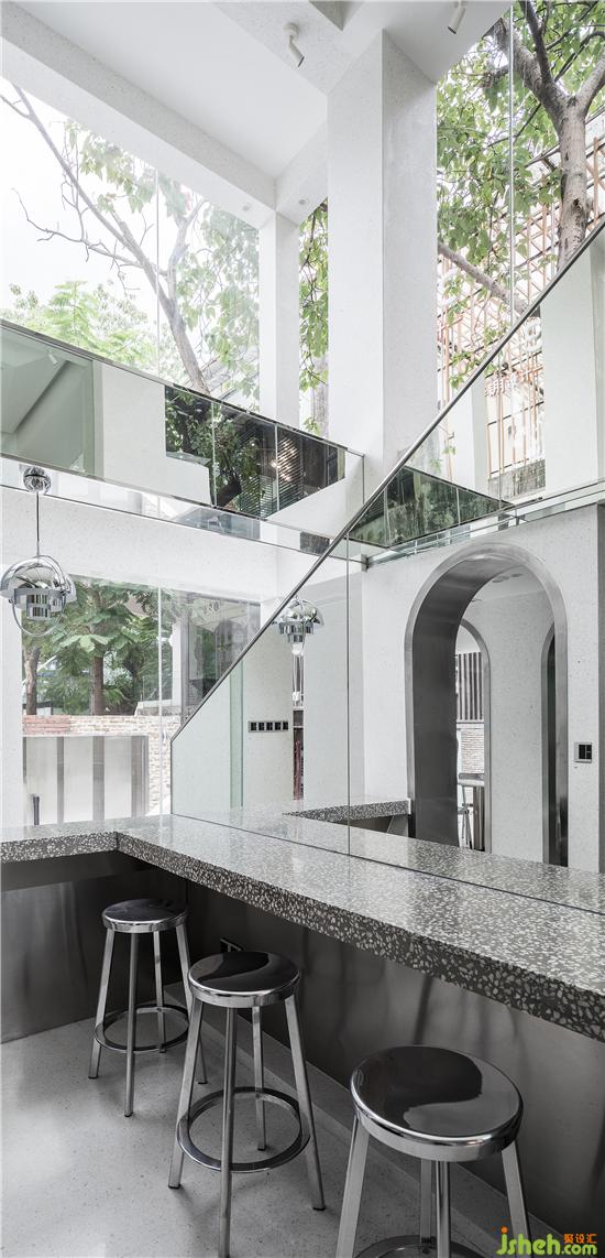 The open round door is wrapped with stainless steel to add senses of style, forming an open and smooth moving line. A semi open wall is set between the office and the window to enhance air convection and defuse space constraints.