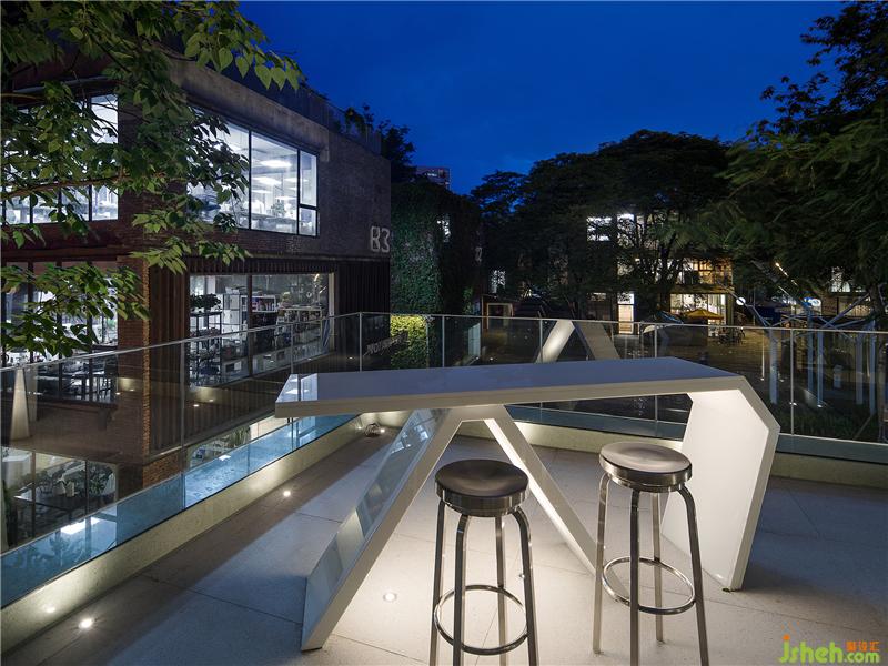 二層水吧區(qū)往外,是一個(gè)小型的花園露臺(tái)。用人造石打造融入建筑外觀的裝置藝術(shù)品,搭配燈光增添建筑的潮流感,同時(shí)兼具吧臺(tái)功能。