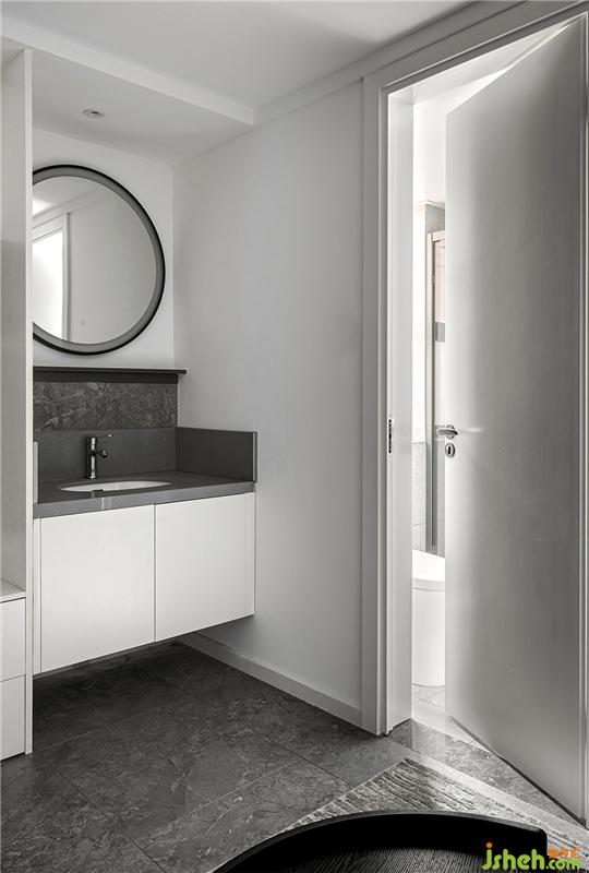 客廳電視墻設(shè)計(jì)柜體與洗漱臺(tái)的結(jié)合,功能疊加,輔助客廳收納的同時(shí),實(shí)現(xiàn)干濕分離。右側(cè)門后是衛(wèi)生間,因?yàn)樵济娣e原因,本身空間局促。室內(nèi)設(shè)計(jì)師通過分析需求和對(duì)空間的重新整合,將洗漱臺(tái)與電視墻作為一個(gè)整體設(shè)計(jì),在解決使用需求的同時(shí),將其融入到客廳的整體氛圍中。