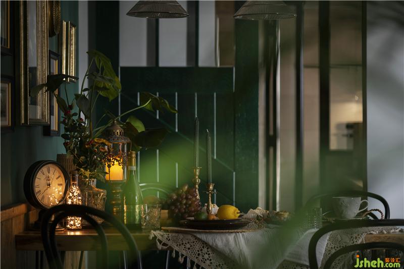 餐廳以暖色老木板與深綠色進行冷暖強烈對比,自然光影與氛圍燈光交相呼應,電影畫面感十足,餐桌上的食物在氛圍的營造下色澤感強,食物在畫面中更顯的鮮美,一副飲食浪漫畫面躍然而生。