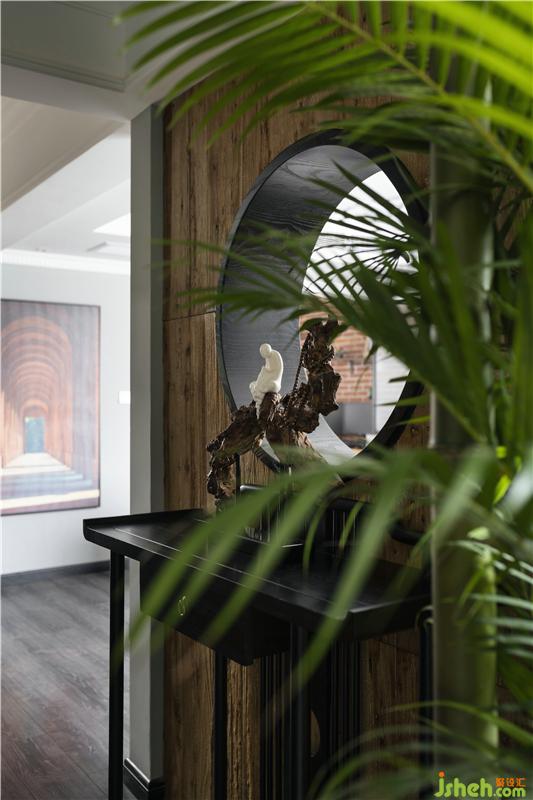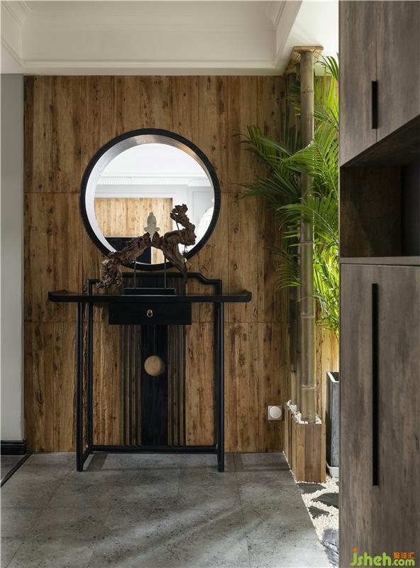 本案例中,室內設計師采用以暗淡的灰、黑色系為渲染的色調,移步于景,入戶端景墻處以中式中心對稱及框景手法,仿佛電影中鏡頭,捕捉圓環(huán)背面景色,墻面采用飽和度高的暖色老木板,側面引入戶外竹子與綠植,冷暖色系交相呼應,光與影的介入,給整個畫面提升視覺沖擊感,竹子下方門檻引入日式“枯山水”,青石板與白色鵝卵石搭配細節(jié),讓人心靈更加安靜與自然。