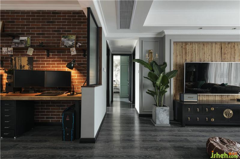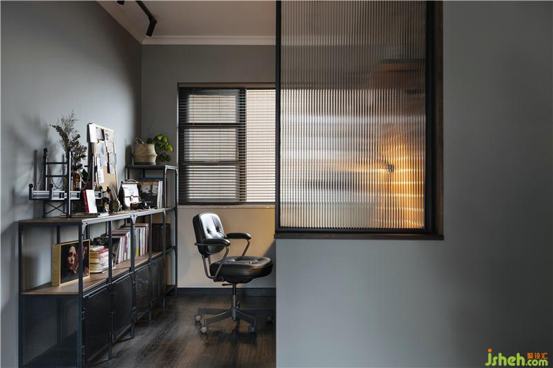 書房采用大面積紅色文化石作為背景,為做動畫設計專業(yè)的業(yè)主帶來工作的激情,同時暖色燈光與自然光線的介入,斑駁凹凸的文化石更具立體感,懷舊情懷映入眼簾。室內設計師以長虹玻璃作為半隔斷,光影與色彩透過玻璃若隱若現,書房與客廳形成情感溝通與互動。