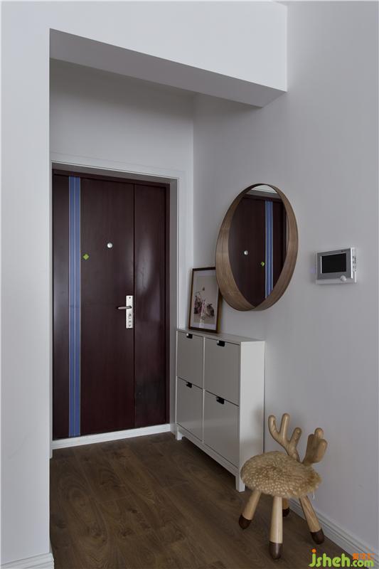 門廳位置側(cè)面墻體的深度不足以設(shè)置常規(guī)深度的鞋柜,挑選了一款下翻式成品鞋柜。鞋柜、裝飾畫、掛鏡、小鹿矮凳的組合構(gòu)成在滿足使用功能的同時也為空間增添一抹趣味。