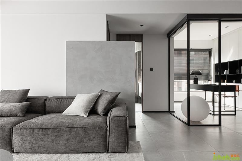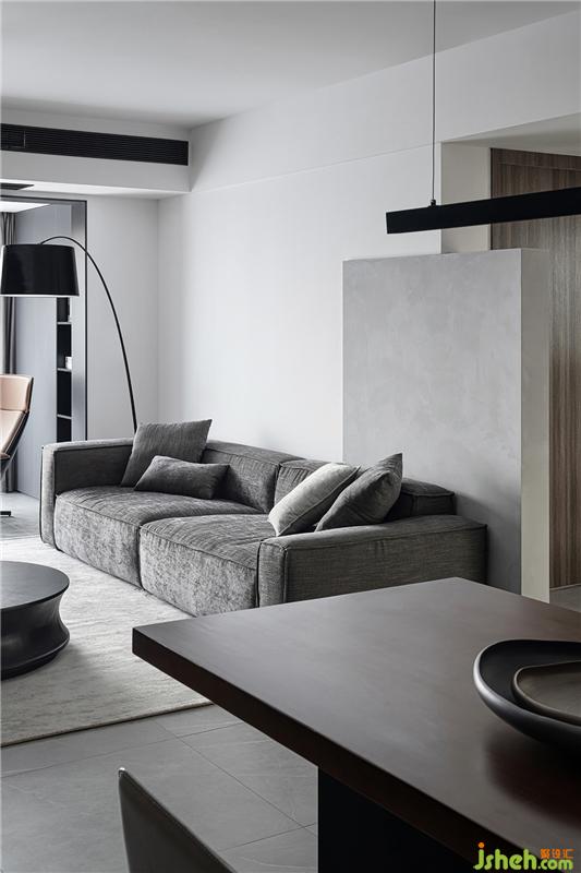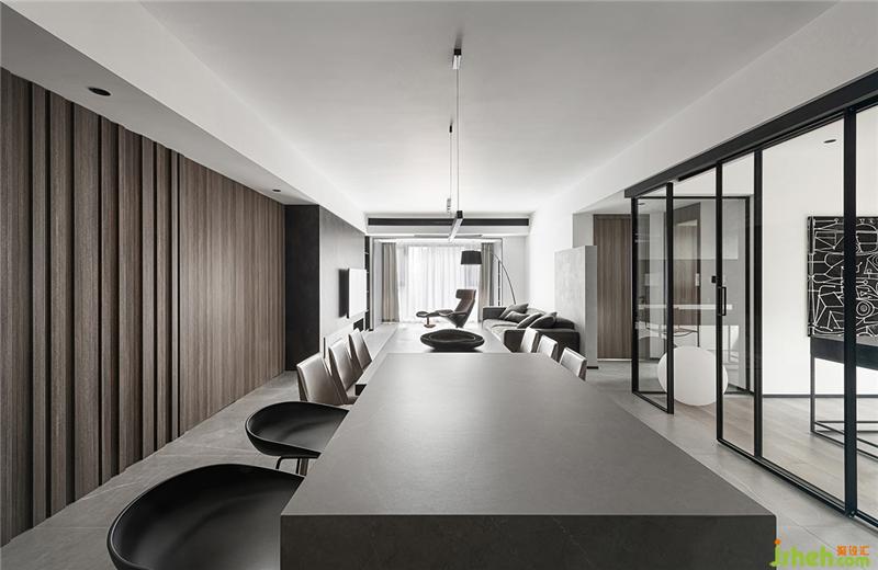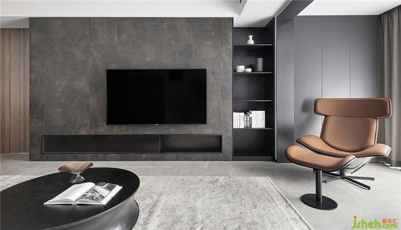 客廳區(qū)域使用單色材質(zhì)的對(duì)比,黑白灰色系的整體搭配方式來進(jìn)行空間氛圍的營(yíng)造,通過木材、水泥漆、石紋墻板和地磚的自然肌理碰撞出不同視覺感受,以不同層次的幾何造型體塊、解構(gòu)、重組、裝置般的處理,創(chuàng)造不一樣的空間立面形態(tài)。