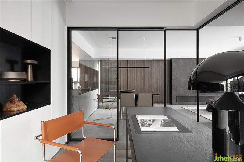 百葉簾的隱約開合、抽象藝術(shù)掛畫的存在以及圓形燈球的交匯相應(yīng),給書房空間注入別樣的氛圍。