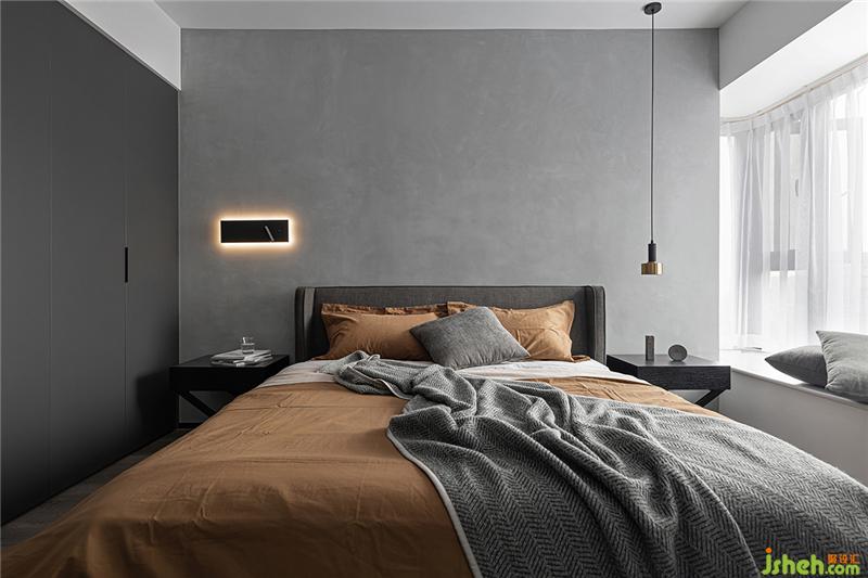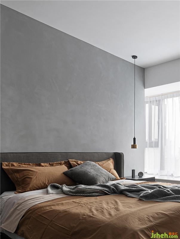 水泥漆、啞光衣柜、亞麻布樣的床頭,不同層次的灰度顏色和自身肌理的呈現(xiàn),加上色彩濃烈的床品,延續(xù)了客廳的設(shè)計(jì)構(gòu)架,避免了空間的色彩單一,同時(shí)也為主臥增加一絲暖意,床頭的壁燈及小型吊燈讓空間多一份情調(diào)。