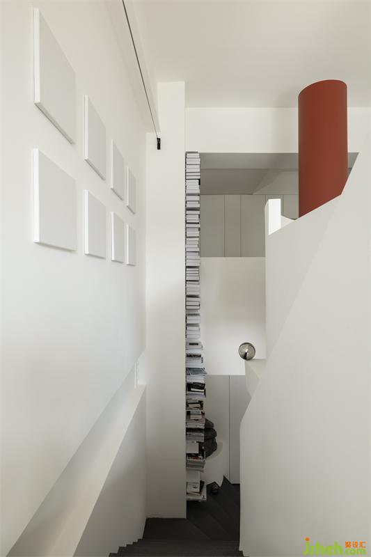 天際線燈橫向的延展、隱形書架縱向的延伸、樓梯扶手不斷的延續(xù)