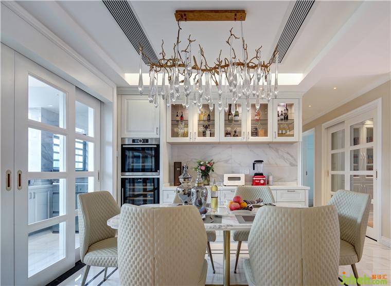褪去繁復(fù),優(yōu)雅重生,用陣列對(duì)稱的陳設(shè)布局營(yíng)造空間儀式感。讓空間引導(dǎo)生活,潛移默化。融入自然元素的陳設(shè)品,讓空間自然靈動(dòng)。餐廳輕松浪漫的氛圍共聚溫馨的每?餐,白色搭配卡其色,盡現(xiàn)優(yōu)雅、極致。客廳與餐廳的設(shè)計(jì)中,高貴的氣質(zhì)在白色與溫馨的灰米色的剎那占領(lǐng)整個(gè)空間,在溫潤(rùn)如玉的質(zhì)感與盈透的色澤中,彰顯著無(wú)與倫比的誘惑魅力。讓身處其間的人,在妙曼的視覺(jué)感受之后,發(fā)現(xiàn)有某些元素能夠觸碰我們內(nèi)心的原點(diǎn)??臻g設(shè)計(jì)在材質(zhì)的鋪陳和搭配上表達(dá)了現(xiàn)代設(shè)計(jì)的特質(zhì),使得空間層次分明。到處彌漫著一種高雅氣息、藝術(shù)的光影斑駁,每一個(gè)節(jié)點(diǎn)似乎都在訴說(shuō)著一個(gè)故事、 一個(gè)真正還原生活本質(zhì)的家。