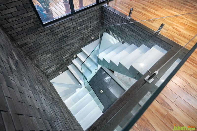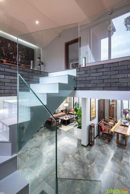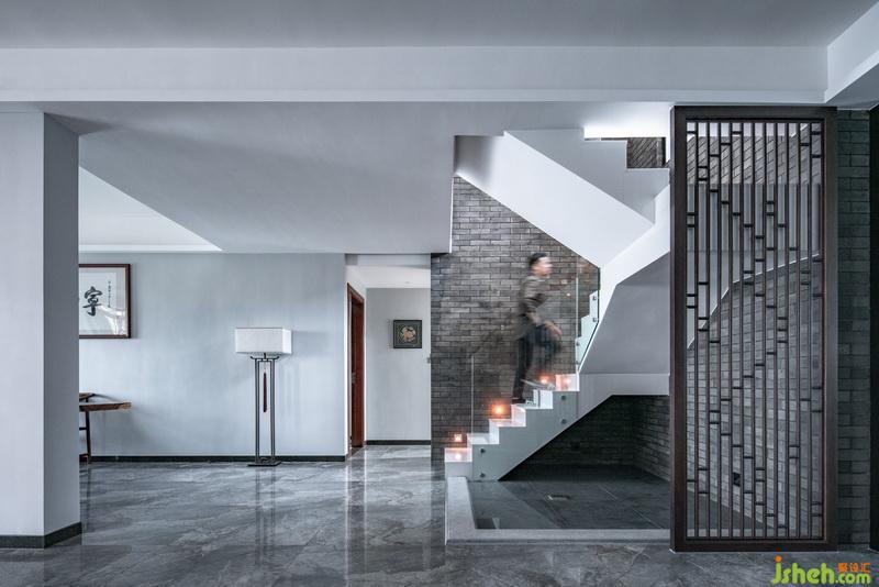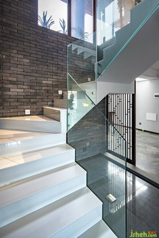 樓梯采用客家天井的開放格局,并在材料上選取中式青磚片和存白色大理石樓梯做個強烈的對比。
