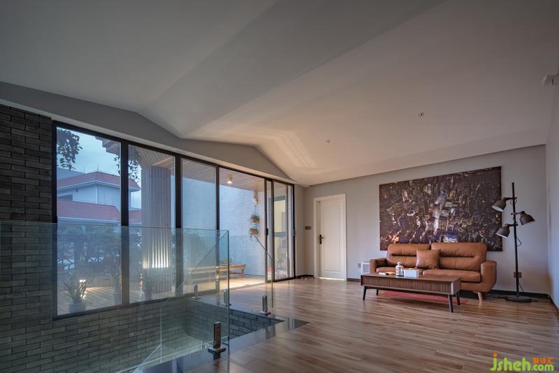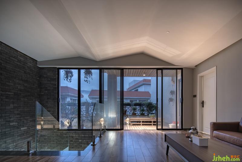 室內(nèi)設計師將二樓斜頂房間采取斜面吊頂形成一個可以自然通風的隔熱層,陽臺用玻璃陽光房的形式拉大使用空間,塑造俯瞰無敵江景的情調(diào)。