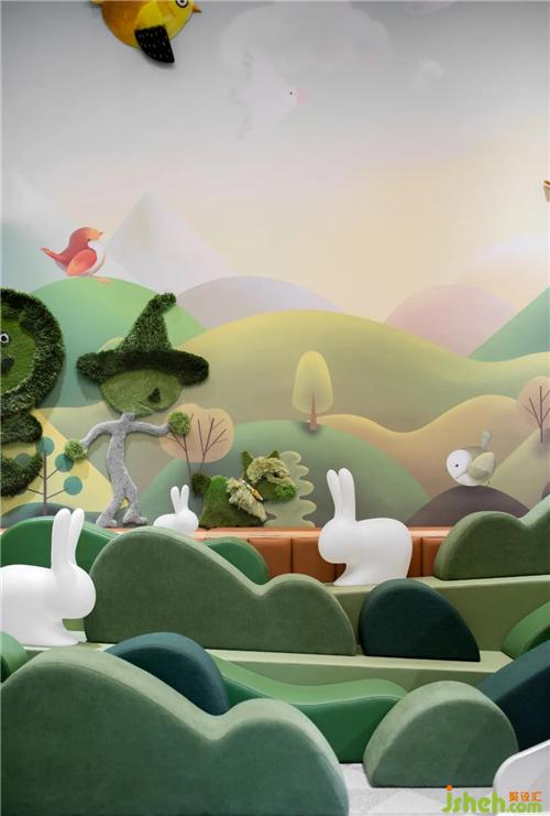設計提取生態(tài)綠意,以溫暖的藝術(shù)漆結(jié)合彩繪的透明裝置,為空間增加了靈氣、呼應了當?shù)乜腿簩γ篮蒙畹你裤脚c向往。深圳售樓處設計童話世界從不只屬于兒童,更是為城市奮斗打拼一族呈現(xiàn)了追尋的詩與遠方。