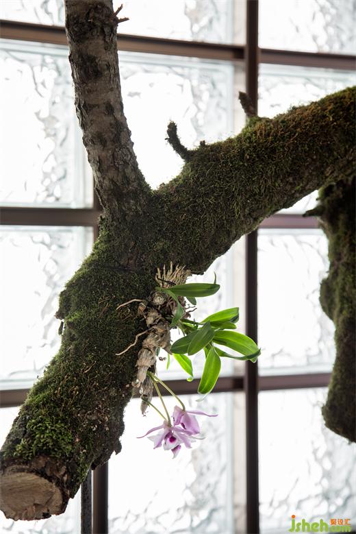 沙盤區(qū)的花藝作品,展現(xiàn)了一種與自然共生的狀態(tài),枝干上生長著苔蘚與附生的藿香石斛蘭,它們彼此和而不同,這亦是一種共生。深圳靜安府售樓處設計以遒勁的枝干為造型主體,置于逆光的玻璃背景前,更凸顯它獨特的線條感,切斷的樹枝形斷意連,營造既東方又當代的空間體驗。The flower art works in the sand table area showcase a symbiotic state with nature, with moss and epiphytic dendrobium agastache growing on the branches. They are harmonious but different from each other, which is also a symbiotic state. The main body of the design is the sturdy branches, placed in front of a backlit glass background, highlighting its unique sense of lines. The cut branches form a broken and connected structure, creating a spatial experience that is both Eastern and contemporary.