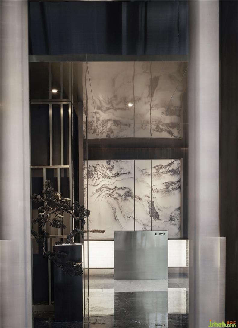 從戶外進入接待前廳區(qū)域,海派東方的意境已經(jīng)如畫卷緩緩展開在眼前:灰白大理石紋樣的前臺背景自帶水墨江南的調(diào)性。餐廳設(shè)計