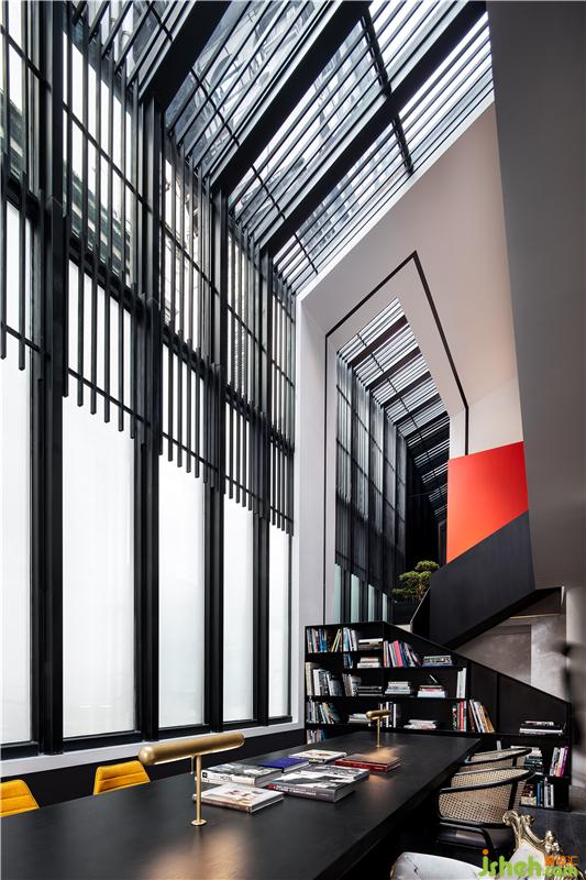 這處中庭景觀樓梯所在位置是老房子的電梯廳,Gary將電梯挪動至房屋的后側(cè),將此處空間解放出來,樓梯也就順勢變成了一種景觀。