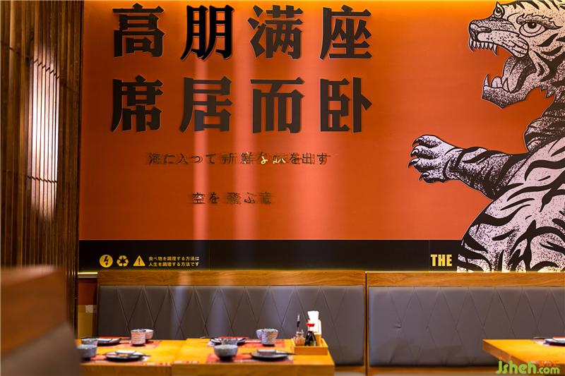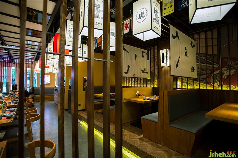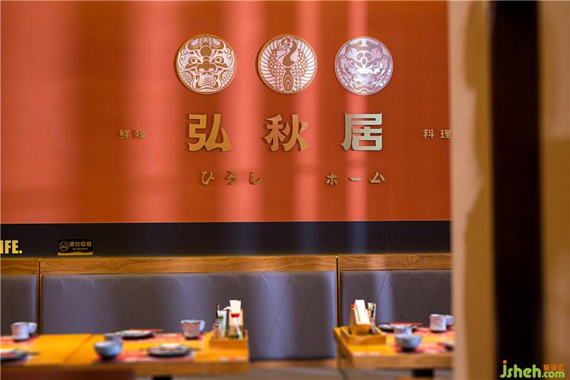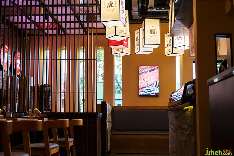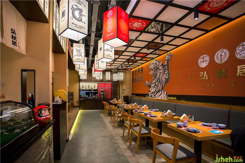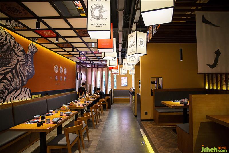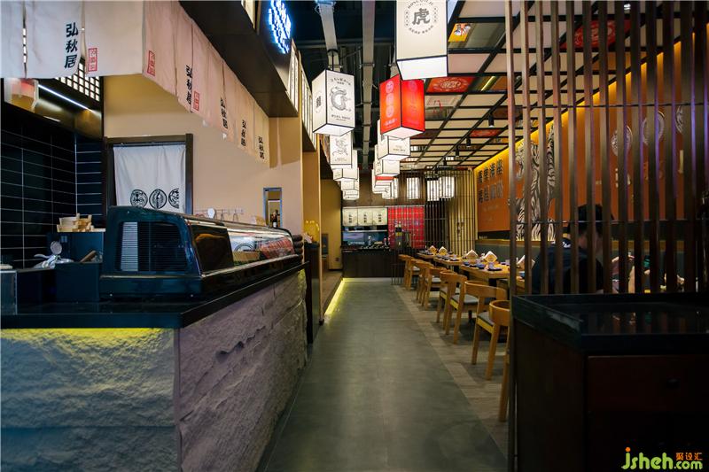 刺身區(qū)灰色墻磚和吧臺石皮俏皮不失端莊。入口就餐區(qū)背景墻運用鉆點紋不銹鋼作為載體背景,增添現(xiàn)代氣息,墻面點綴“龍鶴虎”燈箱,體現(xiàn)弘秋居文化。頂面潮流感的燈籠、吊旗掛飾,為空間增添氛圍。