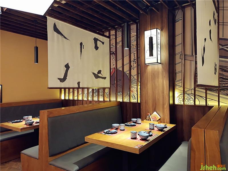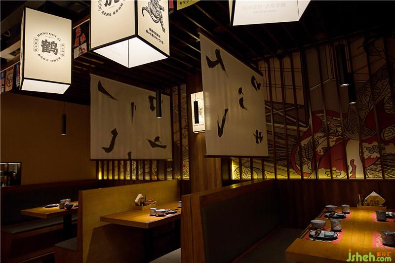 抬高就餐區(qū)墻面木格柵延伸至頂面,營造日式氛圍,浮世繪壁畫若隱若現(xiàn),增添幾分神秘,座位之間布簾增加私密感同時,布面筆觸為“弘秋居”偏旁部首,處處都在渲染弘秋居文化氛圍。