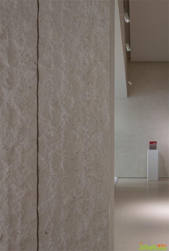 內(nèi)部的每個區(qū)域用多扇的門彼此連接。從入口的廊道進(jìn)入內(nèi)部的空間,依次經(jīng)過前區(qū)開放的區(qū)域和封邊的區(qū)域,廊道的墻壁使用天然的石材。天花被壓低,有種被邀請的和期待的情緒。
